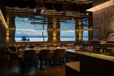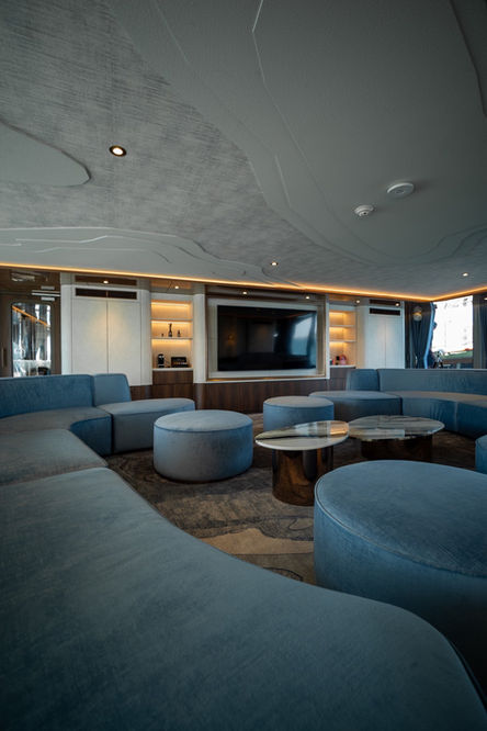 The Saloon on Vela Liveaboard is a luxurious and elegantly designed space that serves as the social heart of the vessel. Featuring expansive panoramic windows, this area offers breathtaking views of the surrounding ocean, allowing guests to relax in comfort while still feeling connected to the beauty of the sea. The interior design blends modern sophistication with a natural marine-inspired aesthetic. Soft, oceanic hues of blue and beige create a soothing atmosphere, while plush seating and carefully curated décor enhance the sense of exclusivity. A state-of-the-art entertainment system, including a large high-definition screen, ensures that guests can enjoy movies, documentaries, or trip highlights in a cinematic setting. Thoughtfully arranged bookshelves and a cozy lounge setup invite travelers to unwind with a good book or engage in meaningful conversations with fellow adventurers.